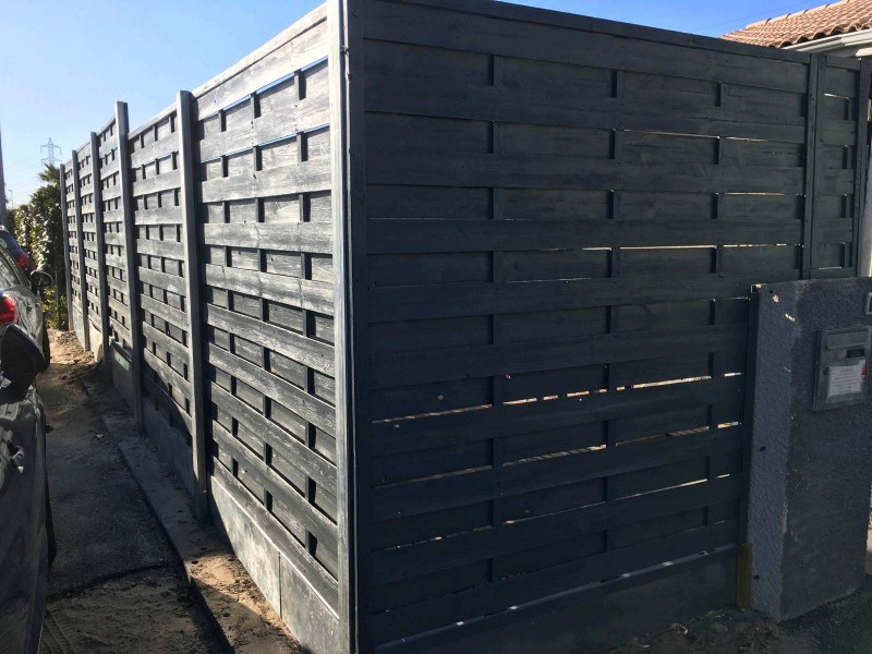 Pour ce chantier les panneaux en bois ont été posés sur des poteaux en acier galvanisé. Un soubassement à été réalisé en plaque d'acier galvanisé afin de rattraper les niveaux du sol. Sur ce chantier les panneaux en bois ont été peints en gris anthracite pour donner un effet moderne.